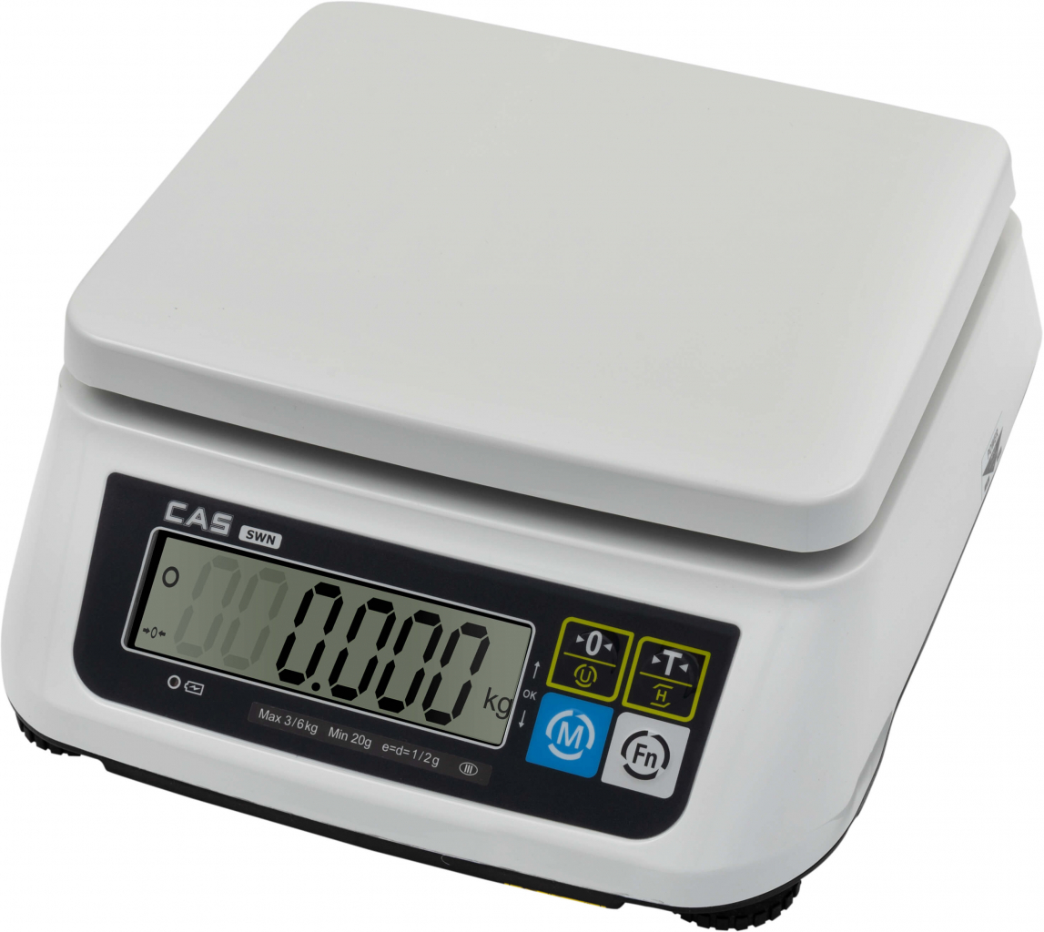 Порционные весы CAS SWN. НПВ-6кг, дискретность-1г. Питание от сети ; Жидкокристаллический дисплей с подсветкой Платформа 226x187. Опции: RS232, USB, второй дисплей. Платформа из нержавеющей стали.